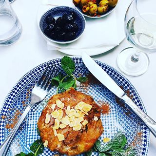 Beurrer un moule rond. Placer 3 feuilles de brick les unes à côté des autres en les faisant dépasser largement du moule. Ajouter une feuille au milieu. Y mettre le poulet bien effiloché. Mettre la compotée d’oignon. Ajouter les amandes grossièrement concassées. Ajouter l’omelette. Replier les bords des feuilles de brick. Mettre une dernière feuille de brick au dessus et la replier pour la coincer sur les côtés.